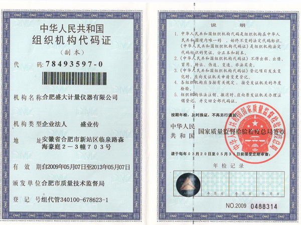 盛大计量组织代码证